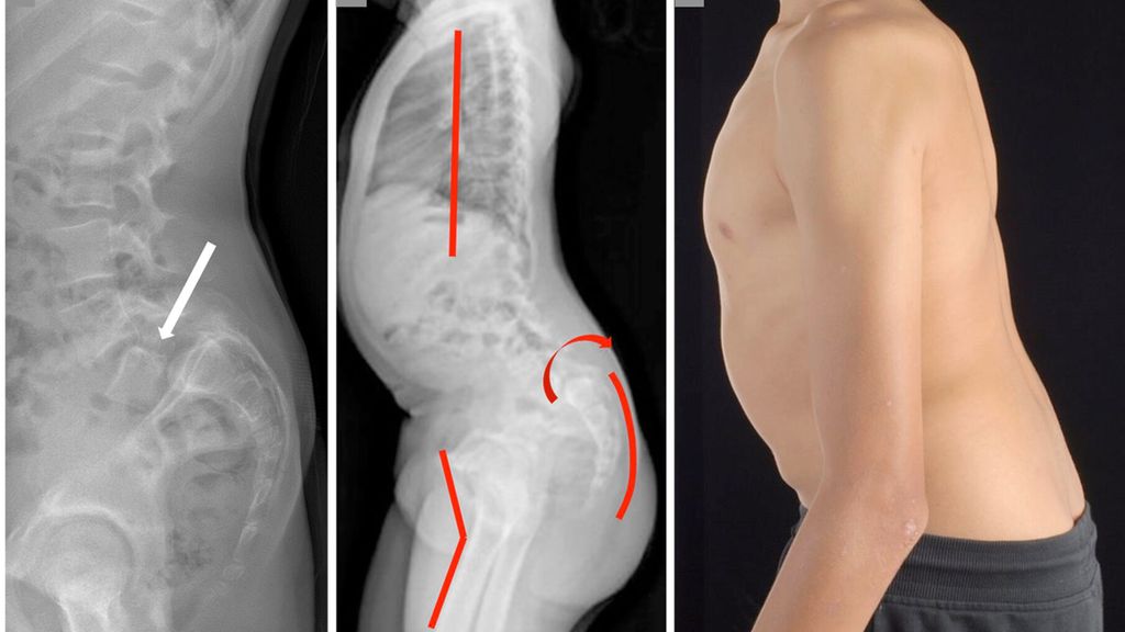 Nebst einer allgemeinen dynamischen und statischen orthopädischen Untersuchung muss eine dezidierte Beurteilung der Wirbelsäule einschliesslich einer neurologischen Untersuchung durchgeführt werden. Typisch für die Spondylolyse sind reproduzierbare, meist klar umschriebene und als stechend beschriebene lumbosakral lokalisierte Schmerzen bei forcierter Extension (Reklination) der LWS. Neurologische Auffälligkeiten sind selten nachweisbar. Bei Vorliegen einer Spondylolisthese kann manchmal eine Stufe zwischen den Dornfortsätzen der unteren LWS getastet werden. Ein hochgradiges Wirbelgleiten führt durch die zunehmende segmentale Kyphosierung zu einer relevanten Störung des sagittalen Profils der Wirbelsäule mit typischen, klinisch objektivierbaren Kompensationsmechanismen wie Abflachung der Brustwirbelsäule, Retroversion des Beckens/Sakrums bis hin zu zunehmender Hüft- und Kniebeugung zur Aufrechterhaltung der sagittalen Gesamtbalance (Abb. 2).