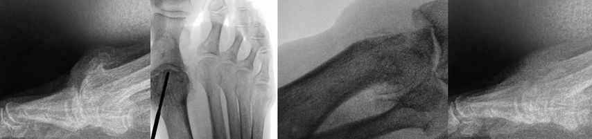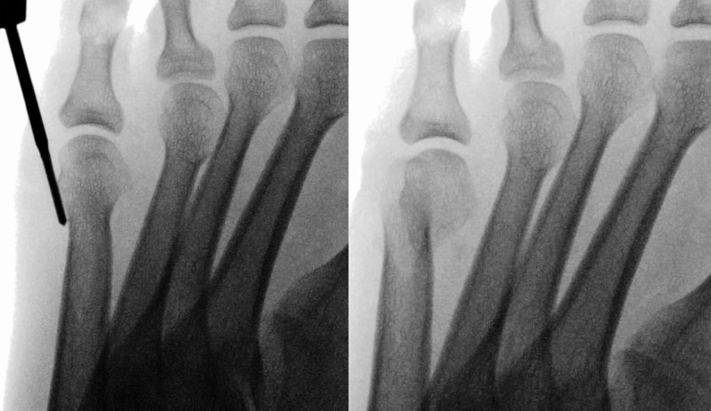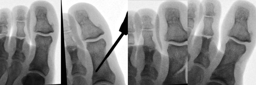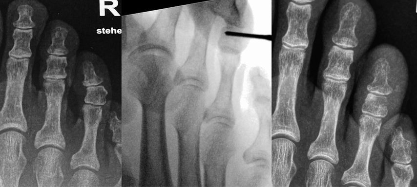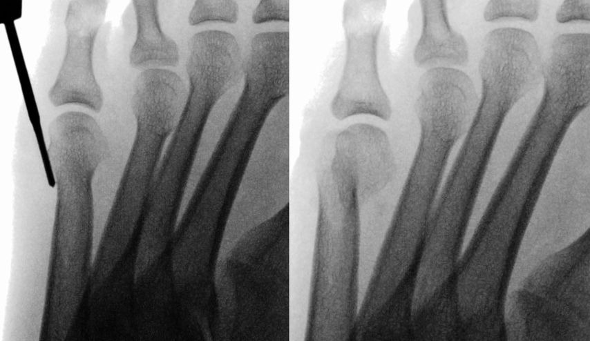 Isolierte Überlängen von Zehen können mit minimalinvasiven Osteotomien an der Grundphalanx sehr gut korrigiert werden (Abb. 6). Bei Fehlstellungen in der Transversalebene wird ebenfalls über eine Stichinzision in Höhe der Fehlstellung eine Kortikotomie durchgeführt und die Fehlstellung durch Schließen der Osteotomie korrigiert (Abb. 7).