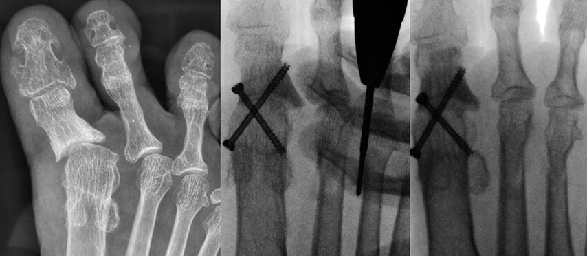 Zur Korrektur des Digitus-V-Varus stehen mehrere minimalinvasive Techniken zur Verfügung. Die Bösch-Osteotomie und deren Modifikationen, die minimalinvasive Chevron-Osteotomie, die DMMO (Abb. 5) und eine proximale minimalinvasive „Closing wedge“-Osteotomie.