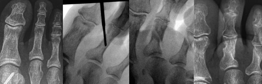 Eine Hammerzehe oder auch mediale bzw. laterale Deviation kann mit perkutan durchgeführten Osteotomien mit der minimalinvasiven Fräse korrigiert werden. Bei einer Hammerzehenfehlstellung erfolgt nach Stichinzision unter der Basis der Grundphalanx bzw. dorsal an der Mittelphalanx, nach Abschieben der Weichteile mittels Elevatorium, mit der Fräse eine Kortikotomie unter Erhaltung der gegenüberliegenden Kortikalis. Dann kann durch Druck die Osteotomie geschlossen und damit die Korrektur erzielt werden. Falls über dem PIP-Gelenk noch eine Prominenz tastbar ist, wird diese über die dorsale Inzision mit der Fräse abgeschliffen.21,22