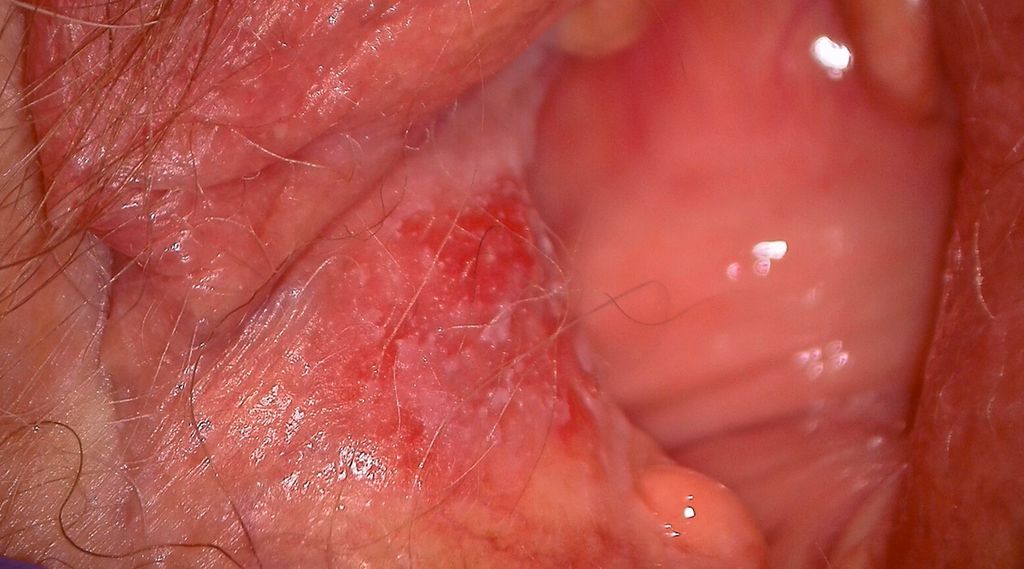 Die Symptome sind unspezifisch und beinhalten meist Juckreiz und Brennen. Etwa 10% der Patientinnen haben zum Zeitpunkt der Diagnose keine Beschwerden. Aufgrund der unspezifischen Klinik wird die Diagnose oft erst Jahre nach Auftreten der ersten Symptome gestellt. Das klinische Erscheinungsbild ist sehr unterschiedlich, variiert farblich und zeigt meist makulöse oder plaqueartige Veränderungen. Die Plaques können ulzeriert oder verkrustet sein oder eine papillomatöse Oberfläche aufweisen (Abb. 1). Häufig sind erythematöse Plaques mit einer typischen weissen Schuppung überzogen. Die durchschnittliche Längsausdehnung der Läsionen liegt bei etwa 7cm. Die von der Patientin empfundenen Symptome stehen jedoch nicht im Zusammenhang mit dem Ausmass der sichtbaren Läsion. Differenzialdiagnostisch muss an chronisch-entzündliche Dermatosen wie Psoriasis vulgaris, Lichen simplex chronicus, Lichen planus, Lichen sclerosus oder Neoplasien wie den Morbus Bowen, das maligne Melanom oder vulväre intraepitheliale Neoplasien (VIN) gedacht werden.3,4