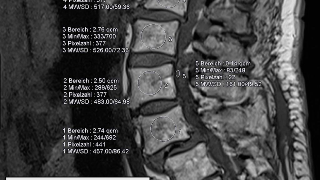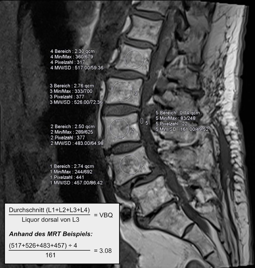 Lässt sich ein Assessment präoperativ zeit- oder strukturbedingt nicht durchführen, können jedoch bereits vorliegende bildgebende Befunde als Informationsquelle genutzt werden. Ein Beispiel ist der MRT-basierte Vertebral Bone Quality Score (VBQ), der im Jahr 2021 von Ehresman et al. beschrieben wurde.9 Die Ermittlung des Wertes wird in Abb. 1 erläutert. Ein anderes Beispiel stellt die Bestimmung der Hounsfield Units (CT-HU) aus einem CT-Scan dar. Ein eindeutiger Cut-off-Wert für den VBQ-Score liegt noch nicht vor, rezente Daten legen jedoch eine Grenze bei ca. 2,4 nahe.10Grundsätzlich besteht eine gute Inter-Rater-Variabilität und die Korrelation mit DEXA-Werten ist gegeben, jedoch kann der VBQ-Score keine DEXA-Messung ersetzen.11 Im Alltag stellt er allerdings eine einfache Möglichkeit dar, Informationen zur Knochendichte zu erlangen, wenn keine rezente DEXA-Messung vorliegt.