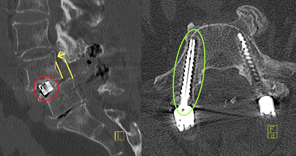 Durch den reduzierten Knochenumbau bei osteoporotischen Patient:innen kommt es auch zu einer verlangsamten knöchernen Fusion, wodurch nicht nur die Risiken für Schraubenlockerungen, sondern auch für Cage-Sinterung (Abb. 2) und Anschlussfrakturen erhöht sind.4, 21 Ein klarer Vorteil für ein bestimmtes Cage-Material dürfte nicht vorliegen. Cages aus Polyetheretherketon (PEEK) oder 3D-Druck versuchen, das Elastizitätsmodell des Wirbelkörpers zu spiegeln. Manche Studien deuten darauf hin, dass reine Titanimplantate eine höhere Sinterungsrate aufweisen als Implantate aus PEEK oder 3D-Druck.25 Viel mehr scheint die Implantatpositionierung und -größe eine Rolle zu spielen. Je mehr Kontakt zur Endplatte besteht, d.h., je größer das Implantat ist und je satter es anliegt, desto eher werden Druckspitzen vermieden und damit das Risiko für Sinterung reduziert.26