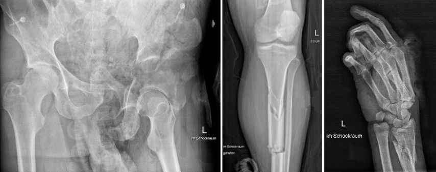 Das Schockraum-ABCDE wird durchgegangen. Im eFAST zeigt sich primär keine freie intraabdominelle Flüssigkeit. Ein Thorax- und ein Beckenröntgen werden angefertigt. Der T-POD wird belassen. Es ist von einem großen darunterliegenden Weichteiltrauma auszugehen. Aufgrund der limitierten Venensituation und des Vorliegens einer Zentralisation muss ein zentraler Venenkatheter angelegt werden. Das Schockraumteam entschließt sich, über die rechte A.femoralis eine REBOA-Schleuse einzubringen, während zeitgleich Röntgenbilder von Unterschenkel und Hand angefertigt werden (Abb.2) und mit dem Massentransfusionsprotokoll begonnen wird (6 Erythrozytenkonzentrate, 1800 PPSB, 4g Fibrinogen, 1g Tranexamsäure). An der linken unteren Extremität zeigt sich eine offene, in einer Vakuumschiene versorgte Unterschenkelfraktur und im Bereich des distalen Unterarms eine drittgradig offene Fraktur mit exzessivem Weichteilschaden, bis in die Mittelhand reichend. Erste ausgewählte Laborparameter sind in Tabelle 1 ersichtlich.