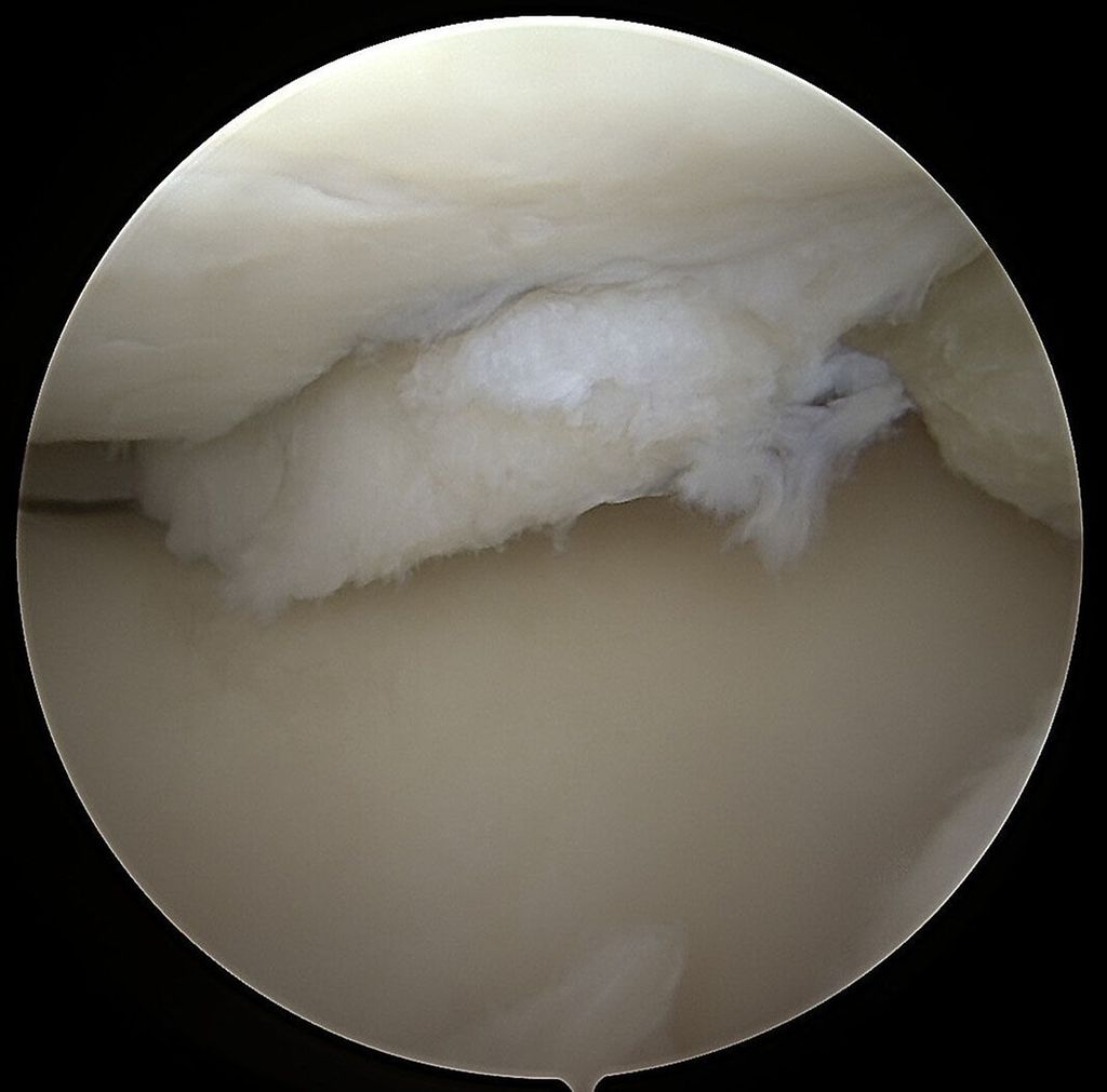 Abb. 2: Das arthroskopische Korrelat des MRT-Bildes zeigt ein instabiles Knorpelregenerat mit fehlender Integration und beginnender Delamination