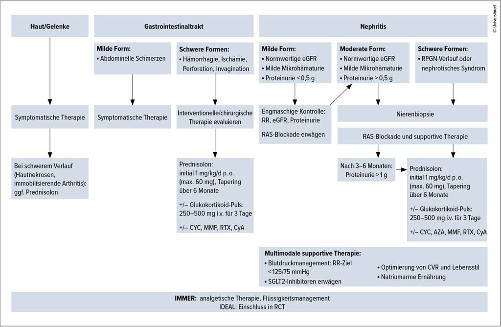 Abb. 1: Therapiealgorithmus der Organmanifestationen bei Kleingefässvaskulitiden unter Berücksichtigung der Erkrankungsschwere (mod. nach 4)