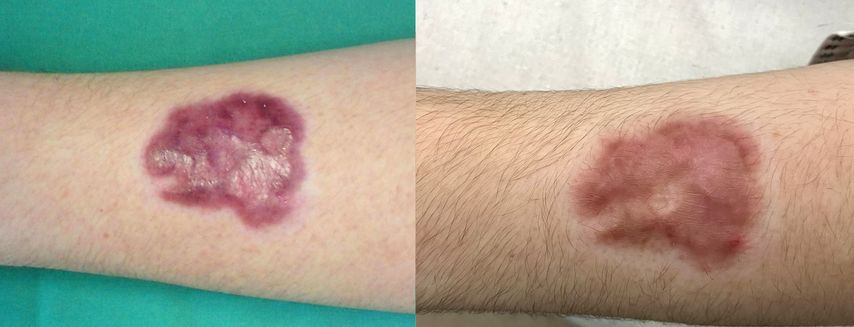 Abb. 2: Links flächig hypertrophe, stark juckende Narbe nach konservativ ausbehandelter drittgradiger Kontaktverbrennung 6 Monate nach Trauma. Rechts nach einer Sitzung einer fraktionierten CO2-Laserbehandlung (12 Wochen später) mit „laser-assisteddrugdelivery“ von Triamcinolonacetonid