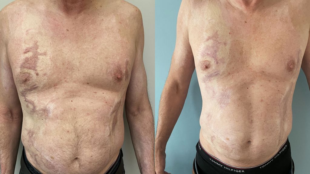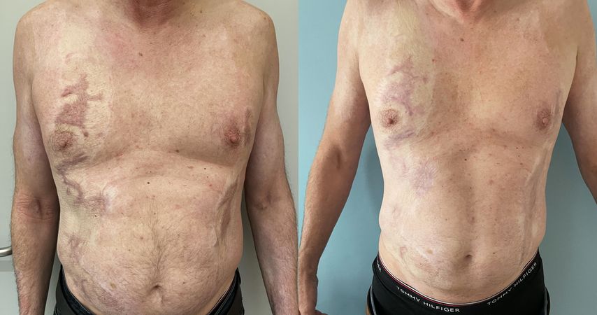 Abb. 1: Links ausgeprägter flächig hypertropher Narbenbefund mit starkem Juckreiz und Narbenschmerzen 1,5 Jahre nach Spalthauttransplantation infolge einer schweren Verbrennungsverletzung und konsekutiver Spalthauttransplantation. Rechts der Befund nach zwei Sitzungen einer fraktionierten CO2-Laserbehandlung