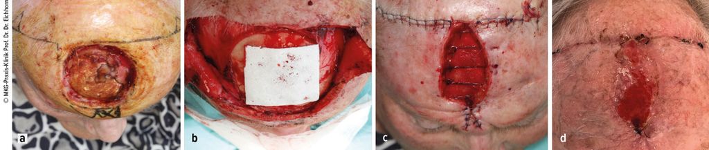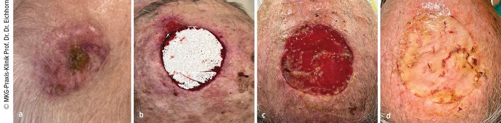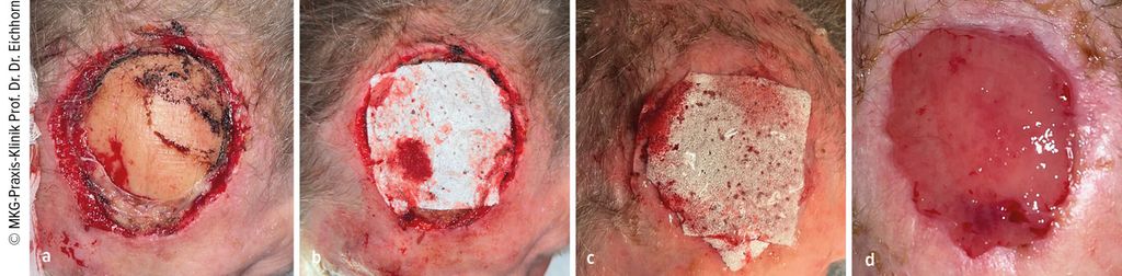 Abb. 3: a) Ausgangssituation: R0-Resektion, freiliegende Kalotte. b) Intraoperativer Situs: Auflage Supra SDRM auf Knochen als Leitschiene für das Granulationsgewebe. c) Heilungsverlauf nach 7 Wochen: Applikation von 2. Supra SDRM zur Förderung der Epithelialisierung, Benetzung mit Polyhexanid-Gel (vor Abdeckung mit silikonisiertem Schaumverband). d) Heilungsverlauf nach 12 Wochen