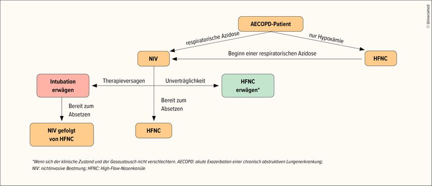 Eine Empfehlung von 2022 besagt, dass bei einer respiratorischen Azidose die NIV nach wie vor Goldstandard ist. HFNC ist Therapie der Wahl, wenn keine respiratorische Azidose vorliegt. Sie kann ausserdem erwogen werden, wenn die NIV nicht vertragen wird. Bei NIV-Versagen sollte eine Intubation in Betracht gezogen werden. Sobald Intubation und NIV nicht mehr nötig sind, kann ebenfalls auf HFNC umgestellt werden (Abb.1).11