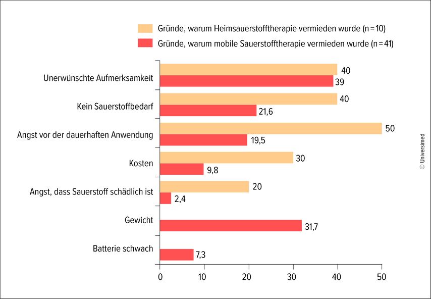 Von den Patienten, die mobile Geräte nutzten, beklagten viele, das Gerät sei zu schwer, die Autonomie zu gering und der Durchfluss lasse sich nicht an ihre Bedürfnisse anpassen (Abb.2). Wichtig ist daher eine Aufklärung der Patienten, warum eine Sauerstofftherapie nötig ist und wozu sie dient.21