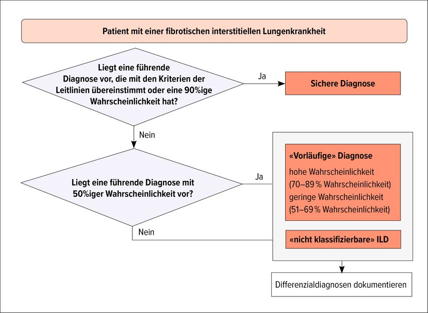 Abbildung 1 zeigt einen Algorithmus zur diagnostischen Sicherheit bei «ILD», den eine internationale Arbeitsgruppe entwickelt hat.1 Eine Wahrscheinlichkeit von mehr als 90% gilt demnach als sichere Diagnose. Zwischen 50% und 90% handelt es sich um eine vorläufige Diagnose und bei weniger als 50% um eine nicht klassifizierbare ILD.