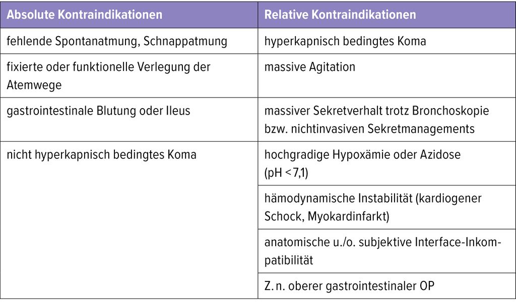 Bei der akuten respiratorischen Insuffizienz (ARI) werden Typ 1 (hypoxämisch) und Typ 2 (hyperkapnisch) unterschieden. Die Anwendung einer nichtinvasiven Beatmung (NIV) bei der ARI Typ 2 stellt, nach Ausschluss der Kontraindikationen (Tab.1), eine klassische Indikation für eine nichtinvasive Beatmung (NIV) im akuten Setting dar. Vor allem im Rahmen einer akut exazerbierten COPD (AECOPD) konnten mehrere Studien zeigen, dass es durch die Anwendung einer NIV sowohl zu einer Reduktion der Mortalität durch Beatmungs-assoziierte Lungenentzündung (VAP) als auch zur Verkürzung von ICU- und Krankenhausaufenthalten kommt. Anhand eines Fallbeispiels wurde nochmals hervorgehoben, dass die Anwendung einer NIV auch bei hyperkapnisch bedingtem Koma oder schwerer respiratorischer Azidose erfolgen kann. Beides ist aktuell eine relative Kontraindikation, kann aber in erfahrenen Teams durchaus zu einem NIV-Erfolg führen und Patient:innen eine Intubation mit evtl. anschließendem prolongiertem oder sogar erfolglosem Weaning ersparen. Dies ist vor allem durch die physiologischen Effekte bei Anwendung einer NIV zu erklären.