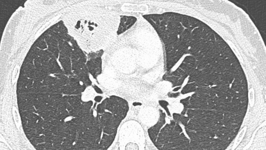 Die initiale klinische Untersuchung zeigte eine milde Sinustachykardie (HF 117/min) und eine leichte Hypertonie (165/96mmHg). Zudem präsentierte sich die Patientin subfebril (37,7°C), ansonsten waren der Status und die Vitalzeichen unauffällig. Das Routinelabor spiegelte eine mäßige systemische Inflammation wider: Leukozyten 12,6G/l, CRP 5,81 mg/dl. Wegweisend war jedoch die Bildgebung. In der konventionellen Röntgendiagnostik des Thorax zeigten sich zwei Konsolidierungen im rechten Oberfeld. Die anschließende Computertomografie offenbarte schließlich zwei markante Raumforderungen im rechten Oberlappen mit zentraler Einschmelzung. Unter dem Verdacht einer bakteriellen Genese wurde eine kalkulierte antiinfektive Therapie mit Ampicillin/Sulbactam eingeleitet.