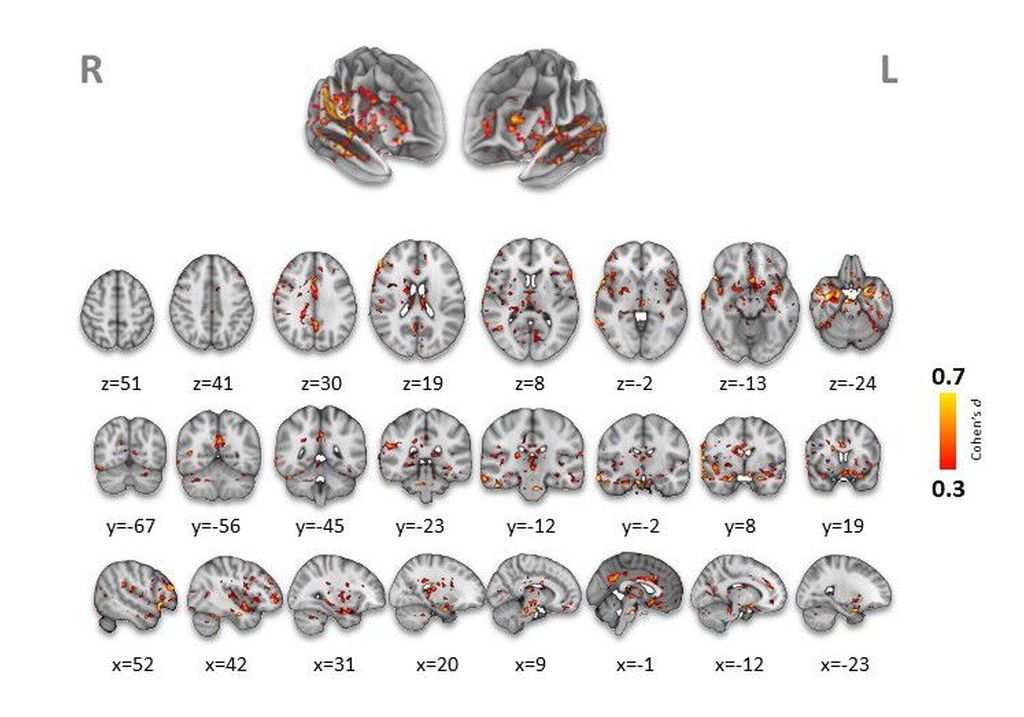 Abb. 1: Der Vergleich der BHS-Permeabilität (Ktrans) zwischen den beiden Kohorten zeigt eine deutlich erhöhte, weitverbreitete Leckage bei Personen mit SSD im Vergleich zu gesunden Kontrollen. Die farbigen Signale markieren Hirnvoxels, in denen in der SSD-Gruppe eine statistisch signifikant höhere Durchlässigkeit (statistische Schwelle: voxelweise p<0,001; FWE-Cluster-korrigiert p<0,05, hier Cohen’s d zwischen 0,3 und 0,7) nachgewiesen wurde. Die Volumenbilder sind in axialer (z), koronaler (y) und sagittaler (x) Orientierung mit den standardisierten MNI-Koordinaten gezeigt. Hinweis: radiologische Konvention, L = R und R = L