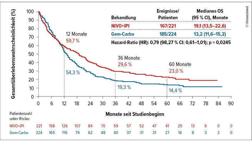 Abb. 1: Gesamtüberleben (OS) Cisplatin-ungeeigneter Patient:innen unter Nivolumab plus Ipilimumab versus Gemcitabin plus Carboplatin (modifiziert nach van der Heijden MS et al. 2025)2