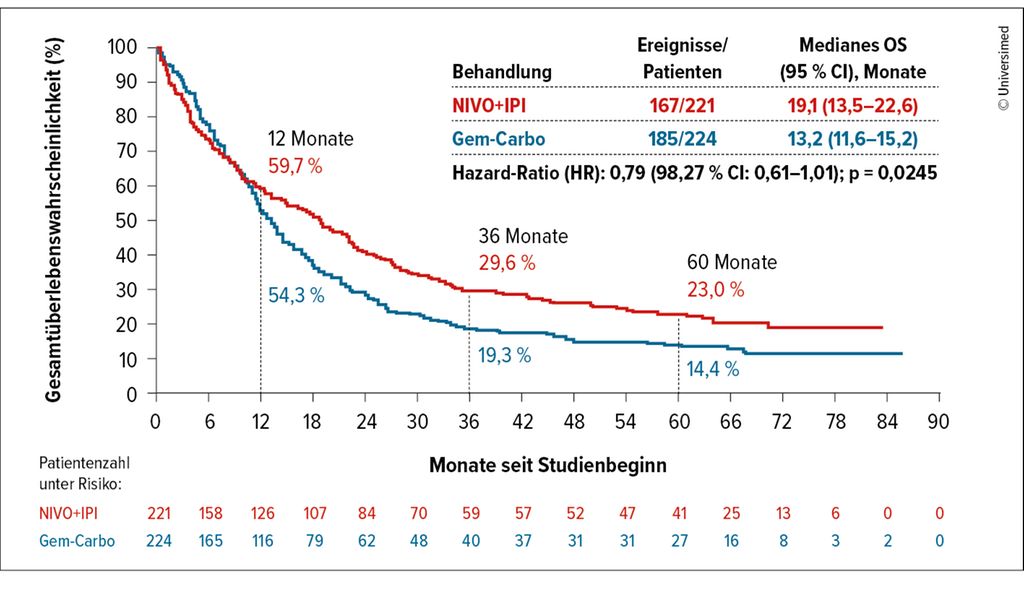 In der offenen, randomisierten Phase-III-Studie CheckMate 901 wurde die Behandlung mit Nivolumab plus Ipilimumab (4 Zyklen) gefolgt von Nivolumab mono (bis zu 24 Monate) mit Gemcitabin plus Cisplatin/Carboplatin (6 Zyklen) verglichen.2 In die Kohorte der Cisplatin-ungeeigneten Patient:innen wurden insgesamt 445 Betroffene eingeschlossen. Primäre Studienendpunkte waren das Gesamtüberleben (OS) der Kohorte der Cisplatin-ungeeigneten Patient:innen sowie von Betroffenen mit einer PD-L1-Expression ≥1%.