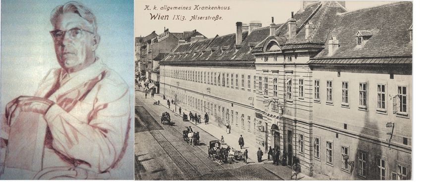 Abb. 7: A: Richard Übelhör. B: Altes Allgemeines Krankenhaus, Alser Straße 4, 9. Bezirk, Ansichtskarte koloriert: Am Ort des Allgemeinen Krankenhauses sollte sich die Geschichte der stationären Behandlung der urologischen Patienten schließen – vom Zimmer „getrennt nach Männern und Weibern“ hin zur ersten urologischen Universitätsklinik.
