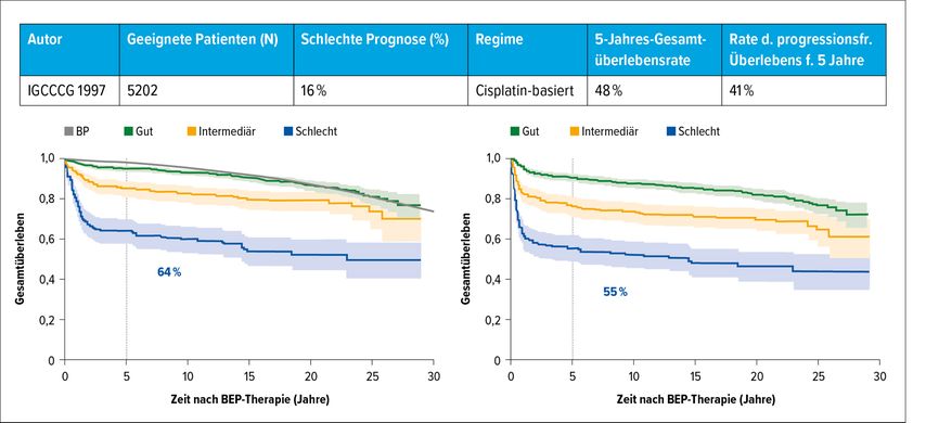 Tab. 2 und Abb. 2: Schlechte Prognose – damals (1997) und heute (2017). Tabelle nach International Germ Cell Cancer Collaborative Group (IGCCCG), J Clin Oncol 1997; 15(2): 594-603; Abbildung nach Kier MG et al.: Eur Urol 2017; 71(2): 290-8